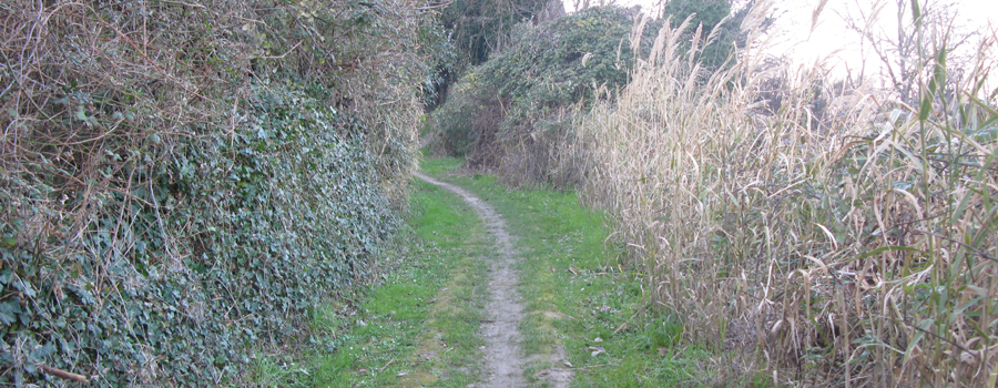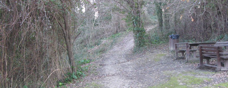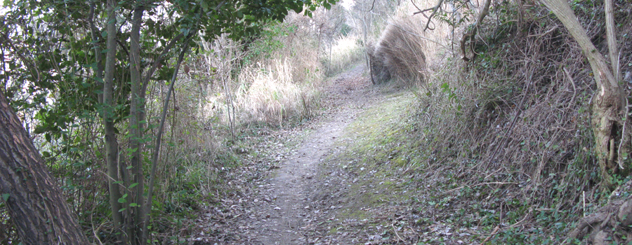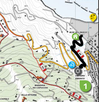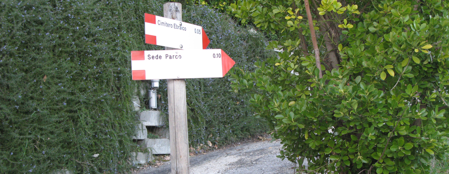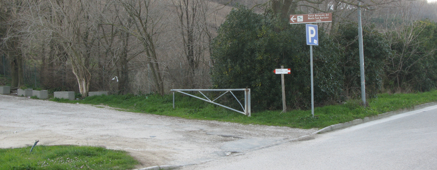 Lasciata la sede del Parco alle spalle, si prosegue su una evidente stradina che si inerpica sul fianco del colle, con media pendenza, attraversando una serie di piccoli appezzamenti di terreno adibiti ad orti che si sviluppano a destra ed a sinistra del percorso.