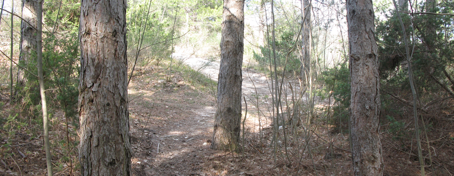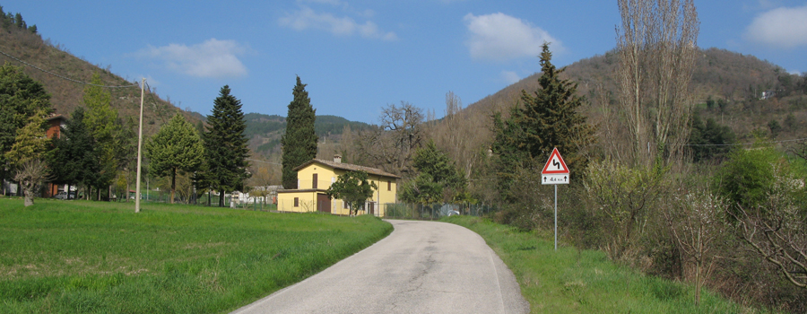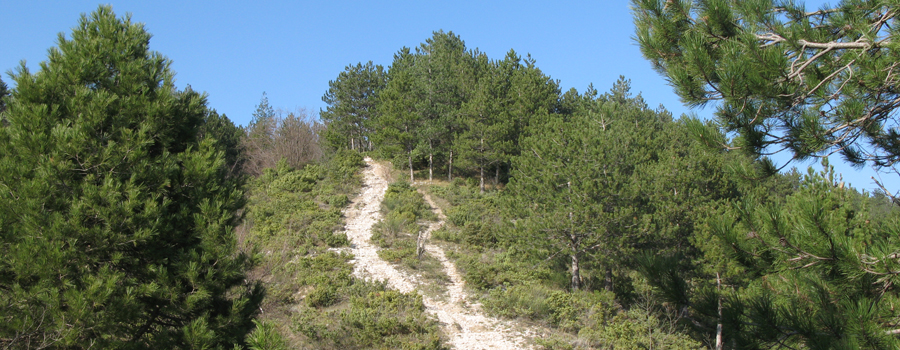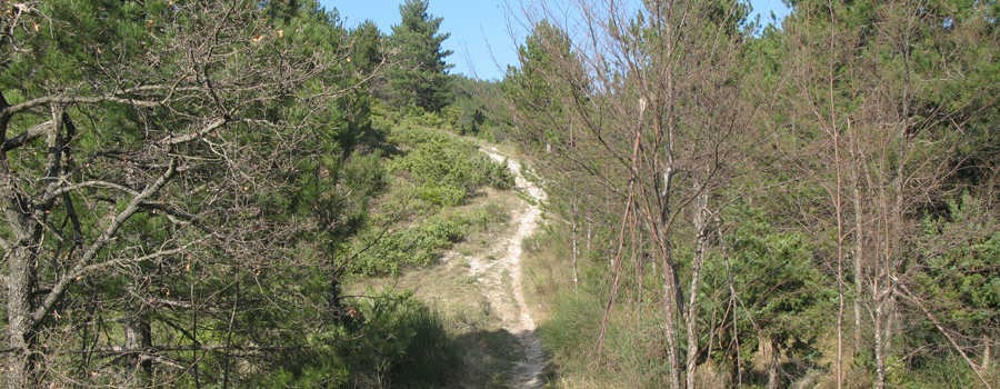 Ben presto il paesaggio cambia aspetto e l’ambiente rurale cede il passo ai consueti boschi con alberi ad alto fusto tipici della zona delle Cesane nei quali il tracciato si immerge, con passaggi nel bosco più fitto che si alternano ad altri in cui la vegetazione si apre lasciando spazio a belle vedute panoramiche sulla valle sottostante e sul dirimpettaio Monte Pietralata.