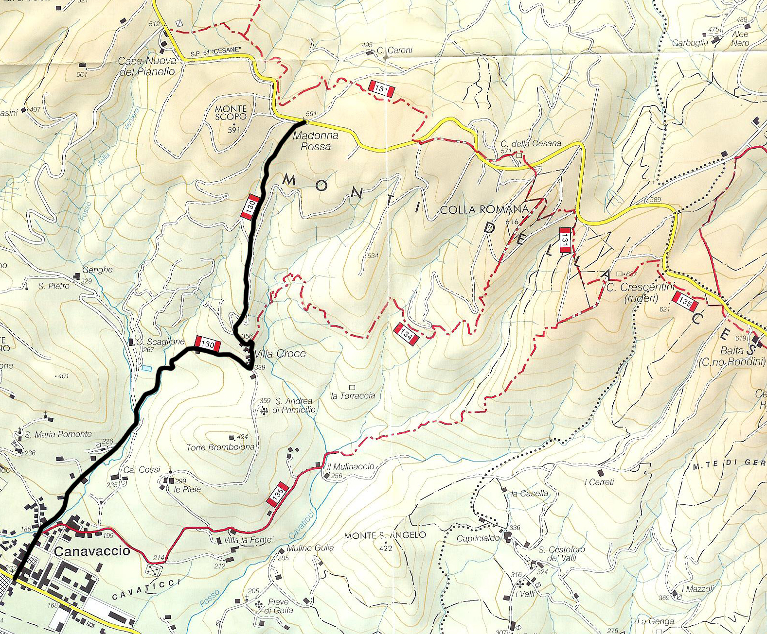 Il sentiero 130 parte proprio dal centro del paese di Canavaccio, in corrispondenza della strada che sale alle Cesane. Si segue l'asfaltata fino alle ultime case dell’abitato, si oltrepassa un trivio nel quale occorre imboccare la strada centrale ed infine si giunge all’attacco del sentiero vero e proprio, che si diparte sulla destra ben segnalato da una freccia direzionale indicante numero e tempi di percorrenza.