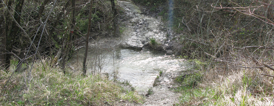 Superata la parte panoramica, si rientra nel sottobosco con pendenze un po' più dure (niente di particolarmente difficile, comunque), affrontando dopo poco tempo un guado sul Fosso delle Genghe (attenzione al fango che precede il piccolo corso d'acqua...) e giungendo quindi nella parte alta delle Cesane, con l'immancabile cornice di pini ad alto fusto caratterizzante questa zona.
