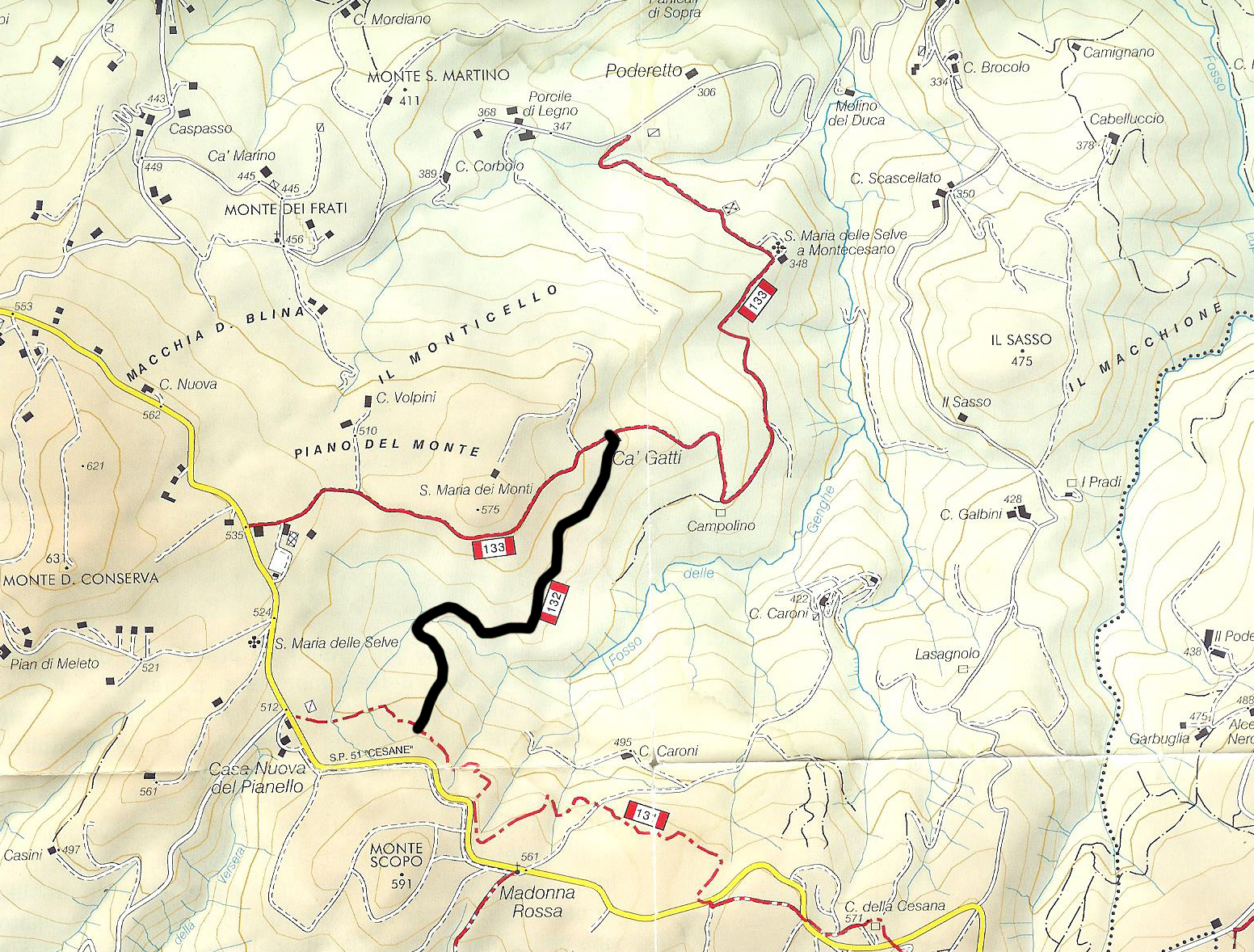 Il punto di partenza è posto in corrispondenza del vecchio casolare abbandonato di Ca' Gatti, in corrispondenza del quale si abbandona il sentiero 133 per svoltare a sinistra, si costeggia quindi il fabbricato prima di immettersi su una debole traccia nascosta tra la vegetazione, che si inoltra in falsopiano nel bosco divenendo via via sempre più evidente.