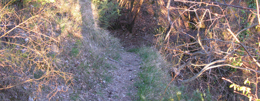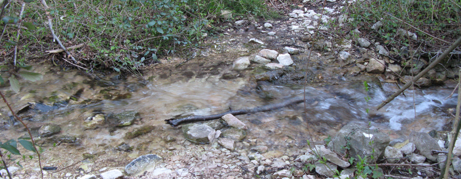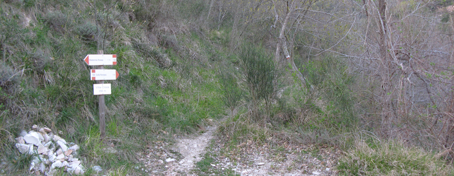 Dalla strada sterrata che conduce al borgo, che in questo tratto coincide con il sentiero 130 che sale da Canavaccio, si svolta a destra su di una piccola traccia (ben segnalata, come la maggior parte dei sentieri del comprensorio) che si inoltra nel bosco immergendosi nella stretta valle del Fosso Cavaticci, incontrando il corso d’acqua dopo breve tempo.