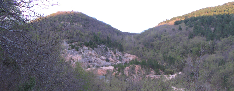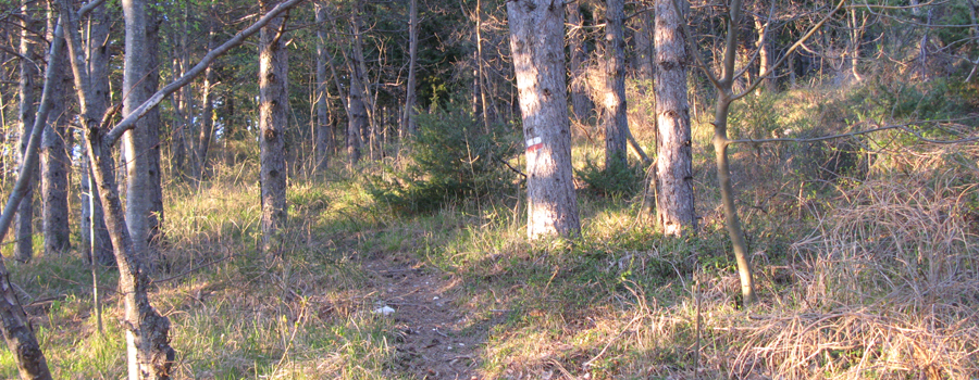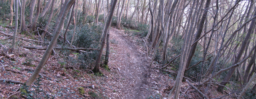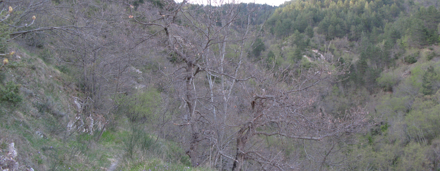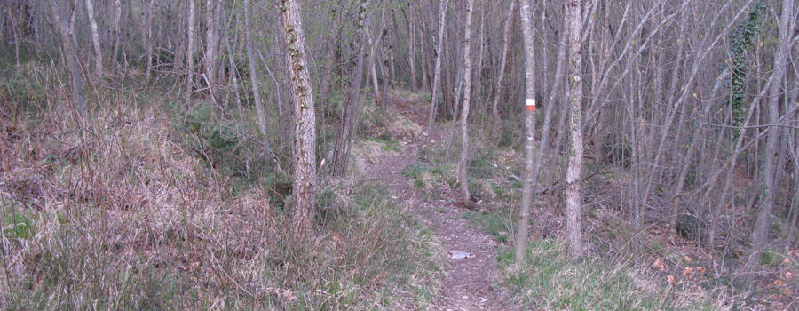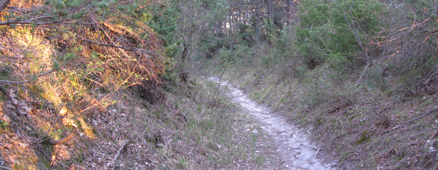 Superato il facile guado si prosegue all’ombra degli alti pini, iniziando a salire in maniera piuttosto decisa superando alcuni tornanti che permettono di guadagnare rapidamente quota, prima di incontrare un lungo traverso che lascia un po’ di respiro, con l’ambiente circostante che si mantiene piuttosto uniforme e tipico del comprensorio delle Cesane.