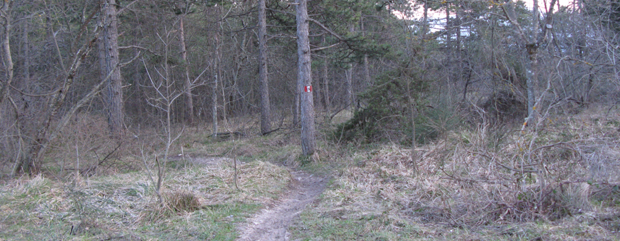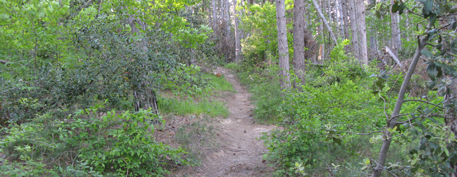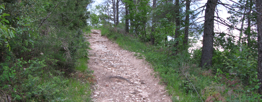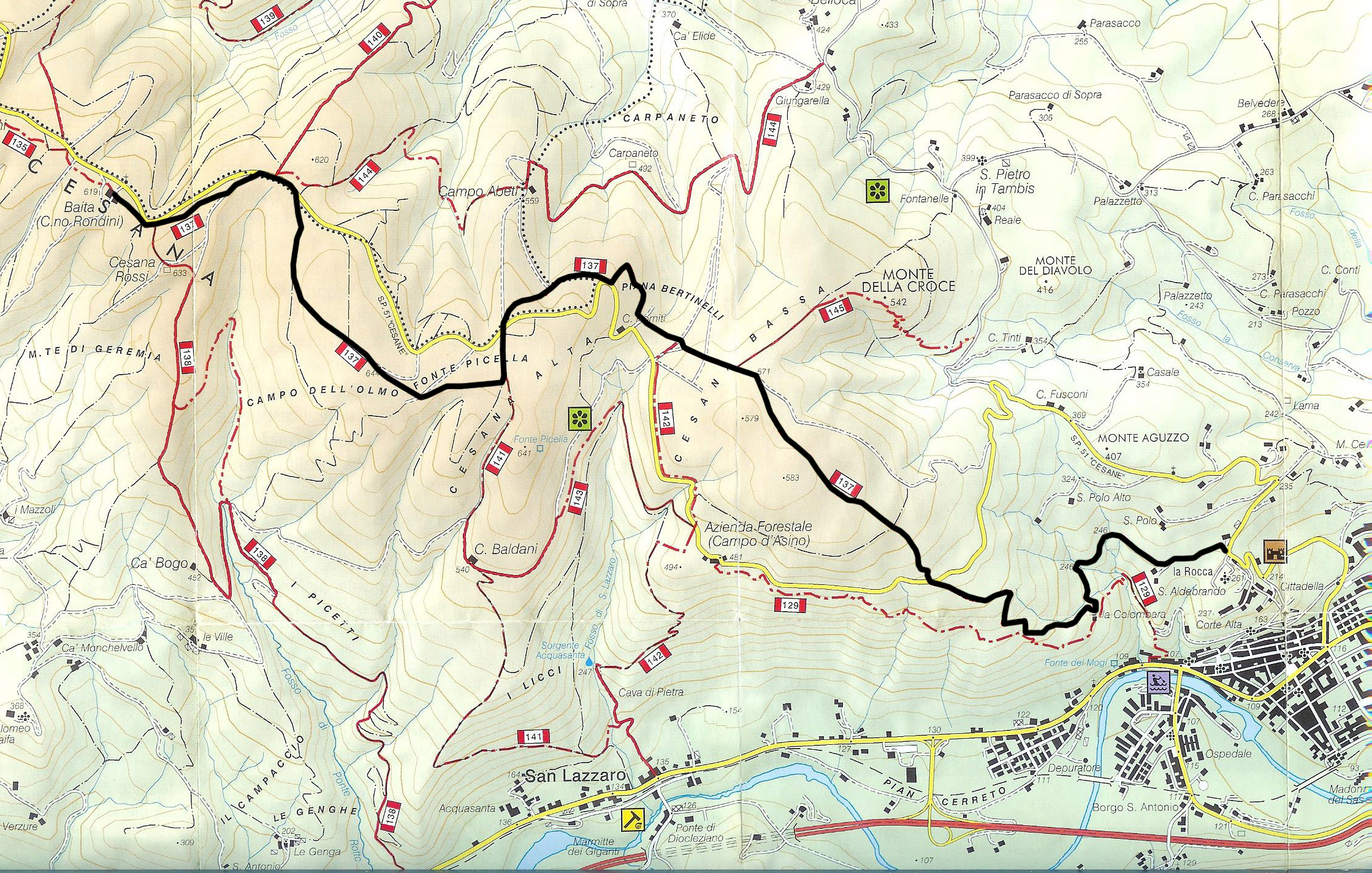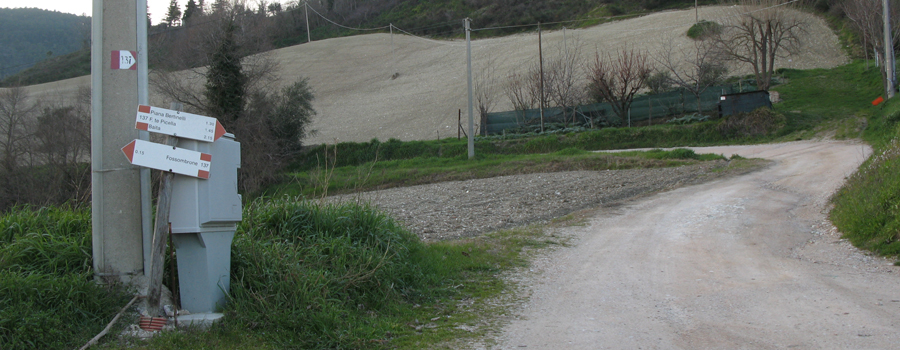 Si percorre la strada per circa 1 chilometro, fino a giungere ad una vecchia costruzione, attualmente in stato di abbandono, dove si svolta a destra, incrociando il sentiero 129 che prosegue in piano sulla sinistra, mentre il 137 prende a salire inoltrandosi nei boschi, subito con pendenze piuttosto impegnative. Il fondo è abbastanza agevole, terriccio intervallato da tratti pietrosi, comunque mai troppo sconnessi, e l’ambiente è caratterizzato dagli alberi ad alto fusto che ricoprono gran parte della zona delle Cesane.