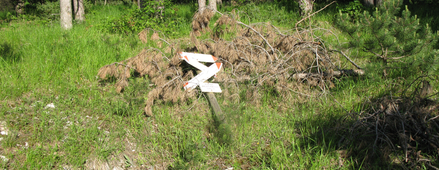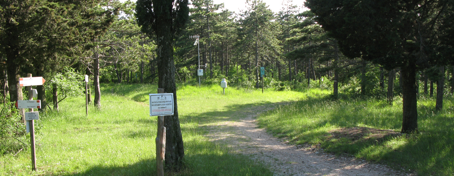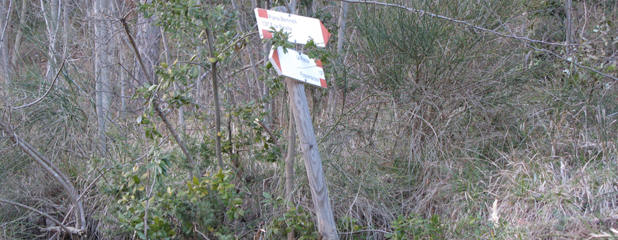 Una tabella con l’indicazione dei tempi di percorrenza indica chiaramente la via da seguire (tutta la zona è molto ben segnalata e l’orientamento risulta sempre agevole) che inizia con un lungo e comodo tratto di stradina sbrecciata, in falsopiano, che s’inoltra tra le sporadiche abitazioni presenti alla volta delle foreste demaniali.