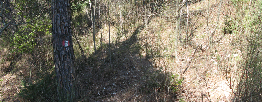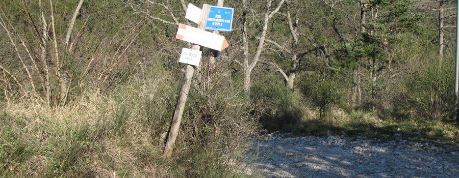 Il segnavia che indica l'inizio del tracciato, tra l’altro caduto in terra e ricoperto da vegetazione, non è facile da individuare perché la natura si è riappropriata della prima parte del percorso, quindi l’attacco attuale si trova su una traccia evidente posta pochi metri a destra del passaggio originario, comunque è impossibile sbagliarsi in quanto molto battuta.