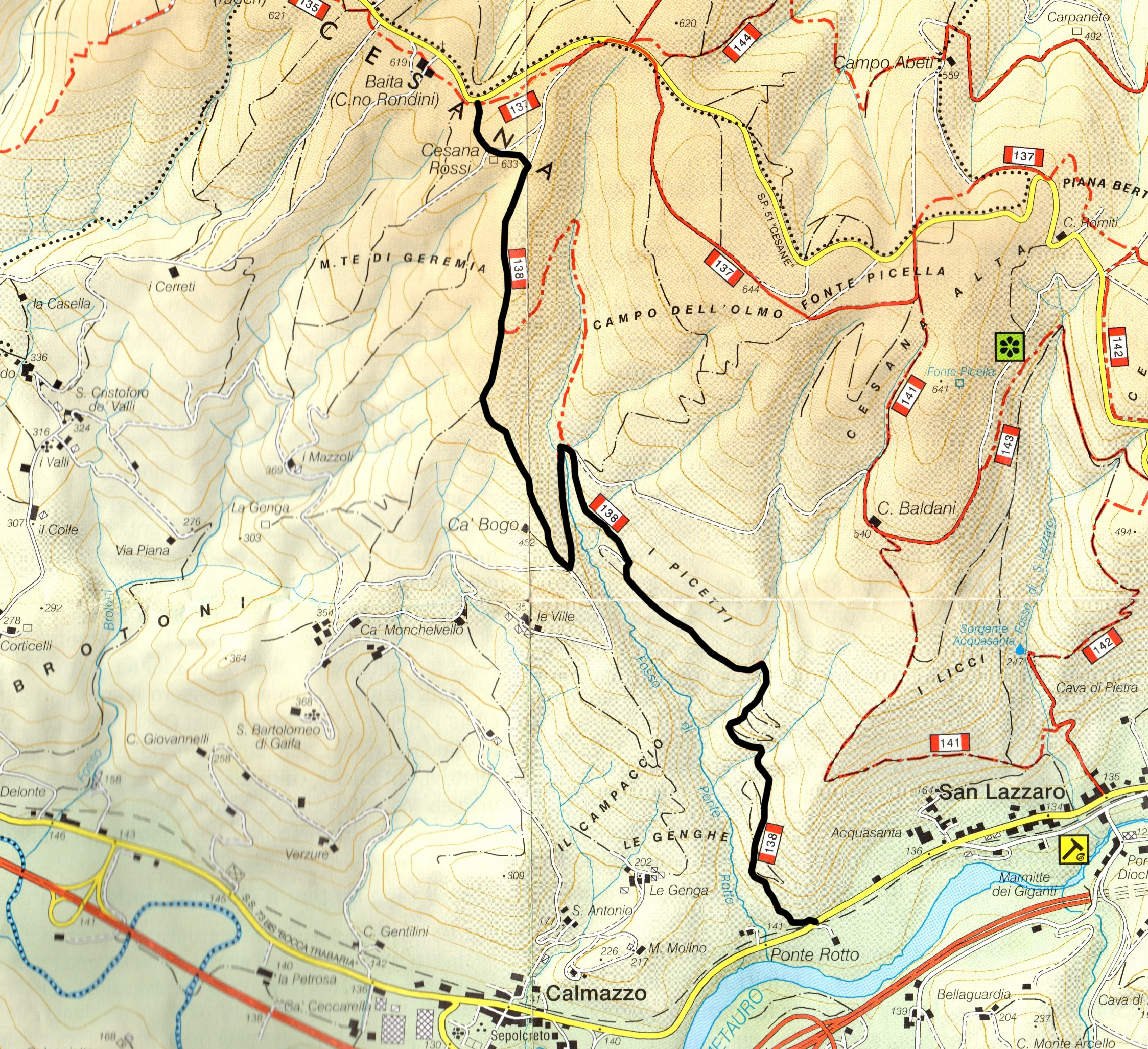 Giunti attorno ai 400 metri di quota il sentiero incontra, poco prima dell’attraversamento dell’impluvio del fosso di Ponte Rotto, un doppio bivio a distanza ravvicinata, dapprima con l’ampia sterrata che conduce a Ca’ Baldani (denominata sentiero 138A), successivamente con la variante che segue il corso del fosso e si ricongiunge, più a monte, con il percorso principale.