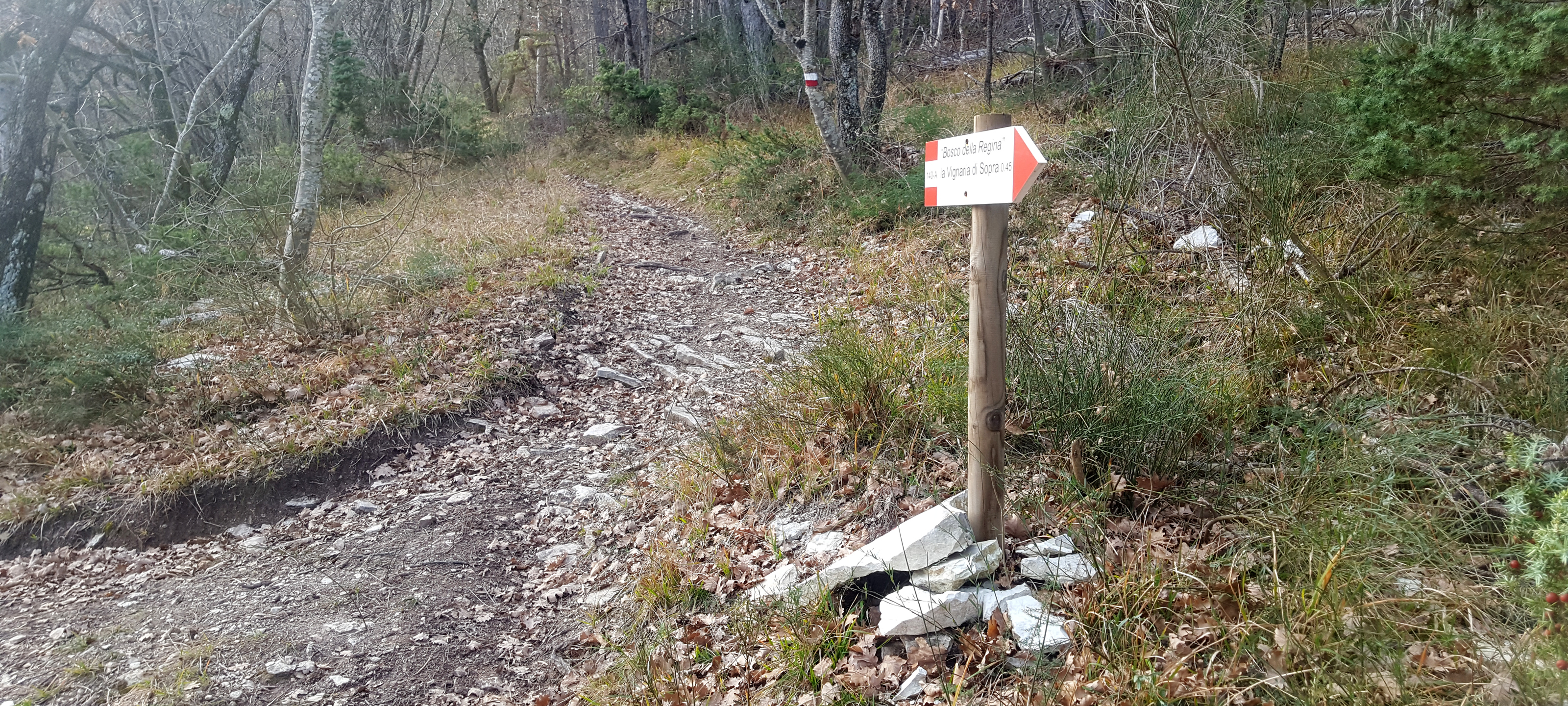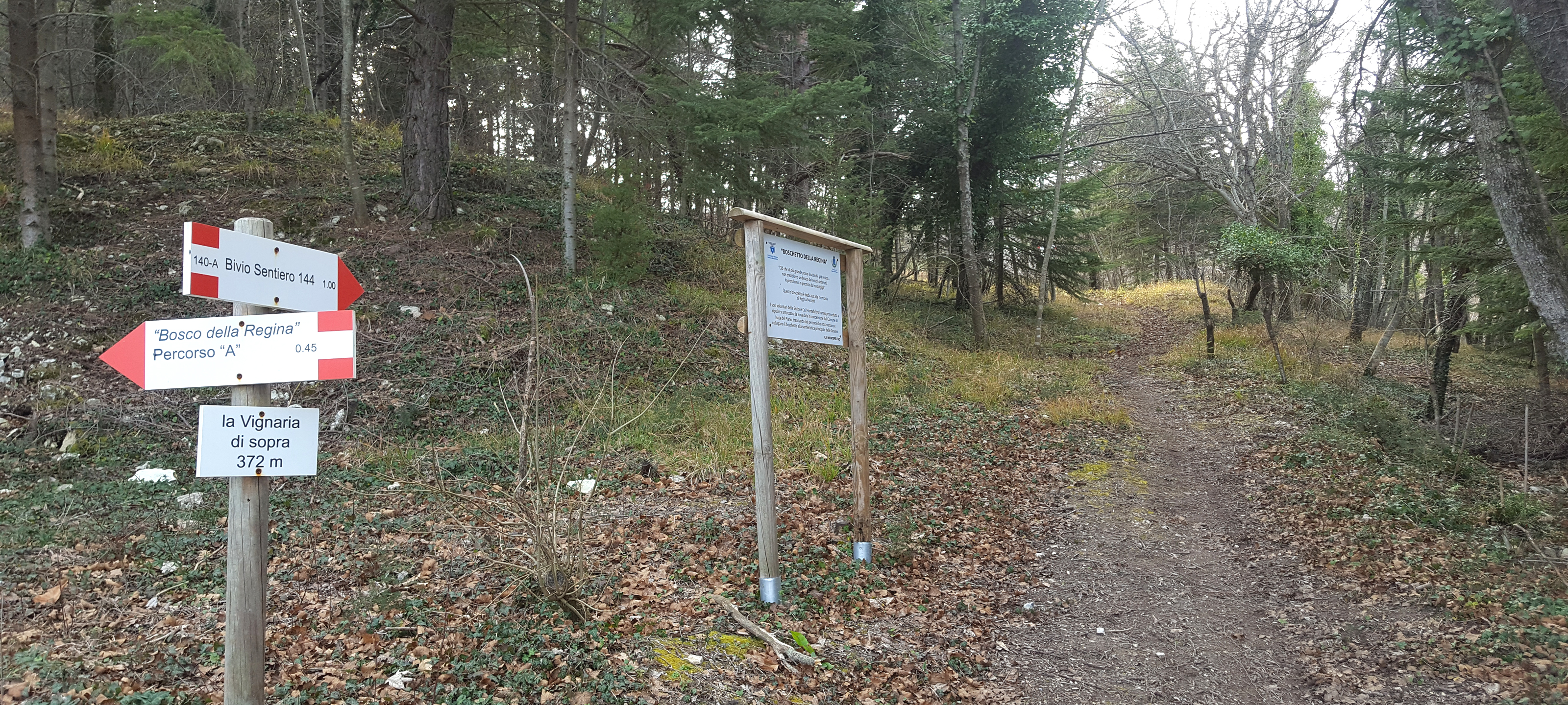 Come accennato, si parte dal “Boschetto della Regina”, presso il quale è stata creata una piccola area di sosta con panchine e tavoli e sono stati realizzati due percorsi che permettono di scoprire gli angoli nascosti del bosco; si inizia subito a salire verso il crinale, incontrando dopo pochi passi l’incrocio con il Percorso B che si sviluppa verso sinistra.