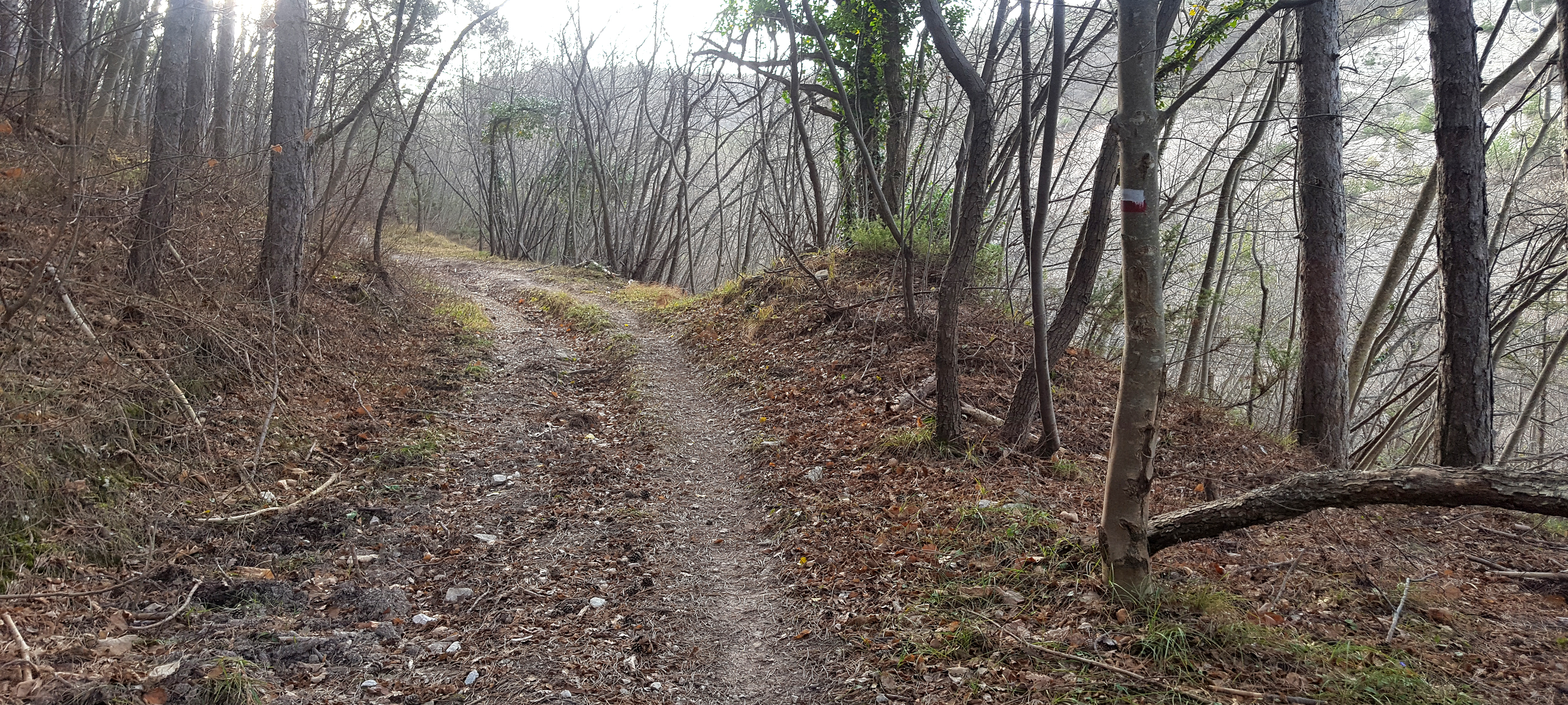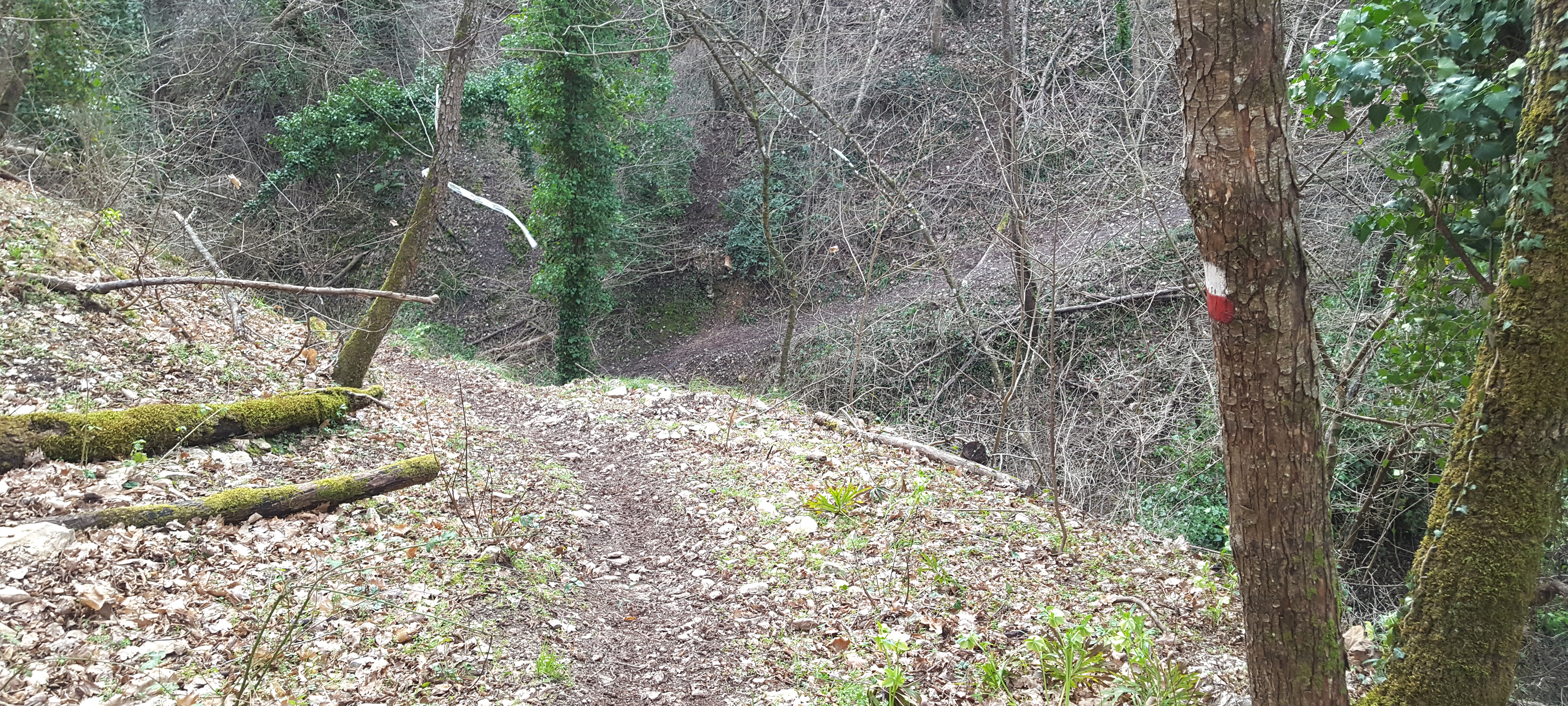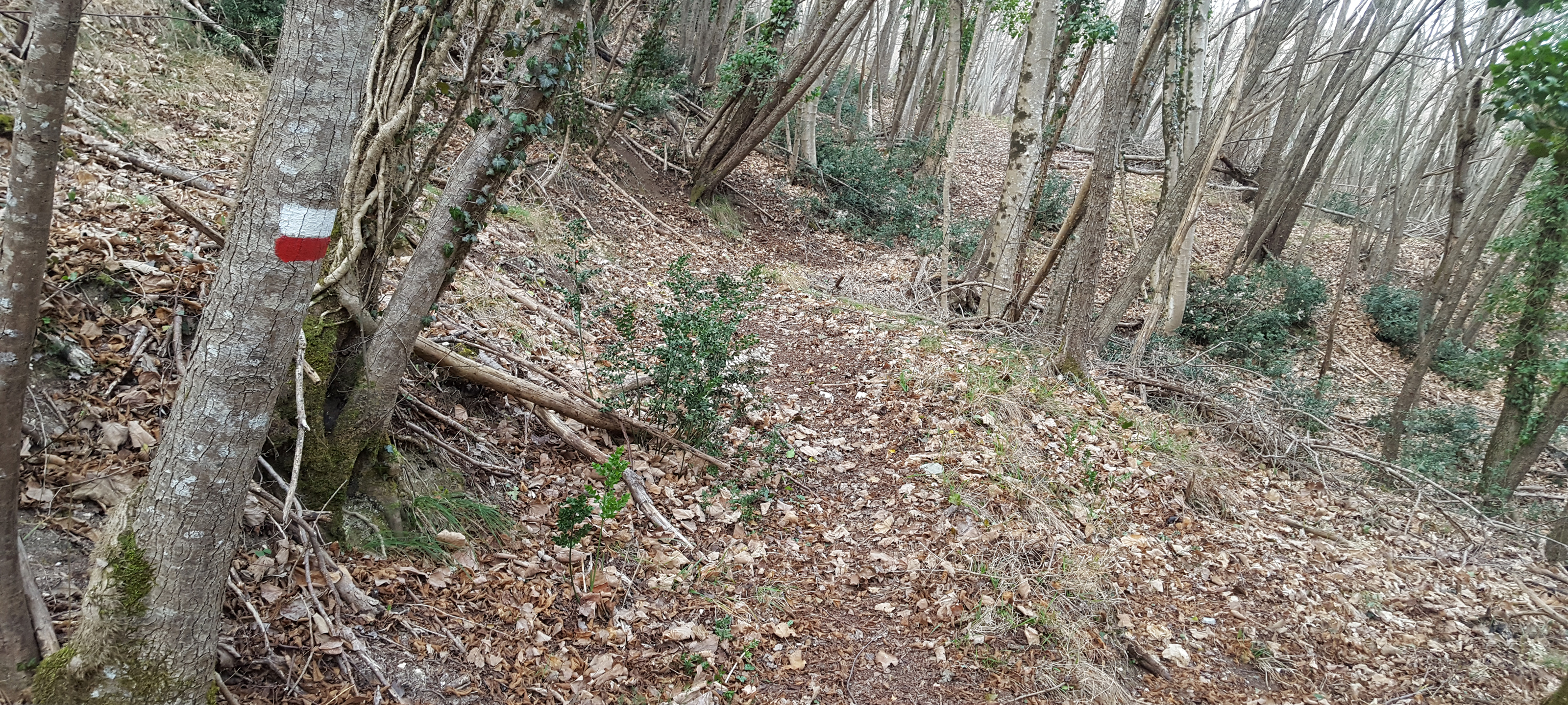 Dopo aver percorso qualche centinaio di metri si raggiunge un nuovo incrocio con il percorso B, che giunge da sinistra uscendo dal bosco, subito prima di affrontare una ripida discesa verso un impluvio, superato il quale si ricomincia a salire in maniera più decisa rispetto al tratto precedente, affrontando il tratto più ripido del sentiero.