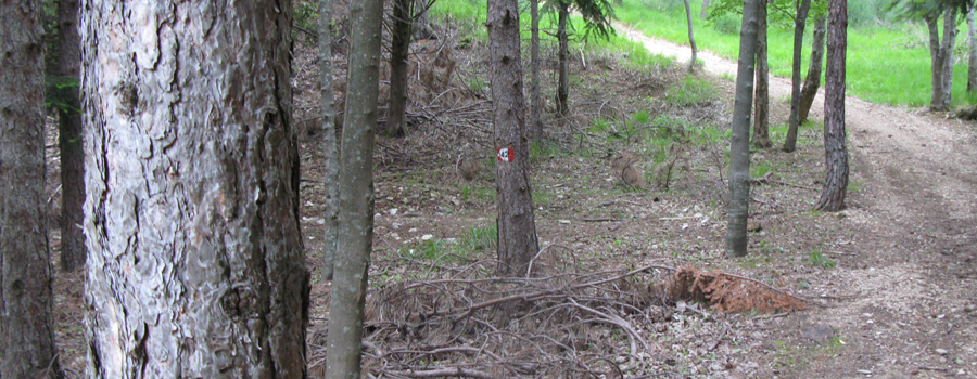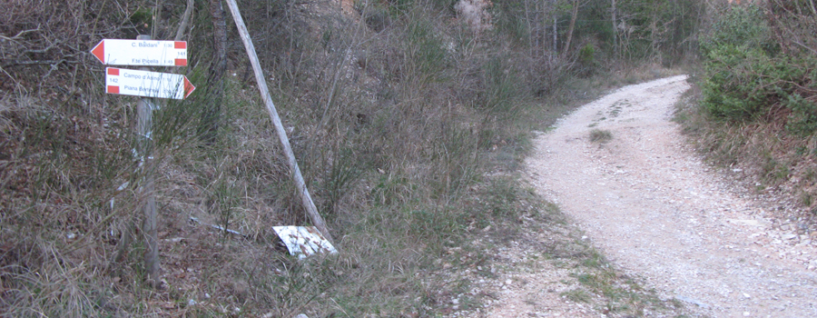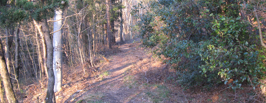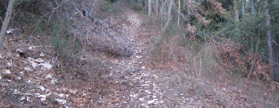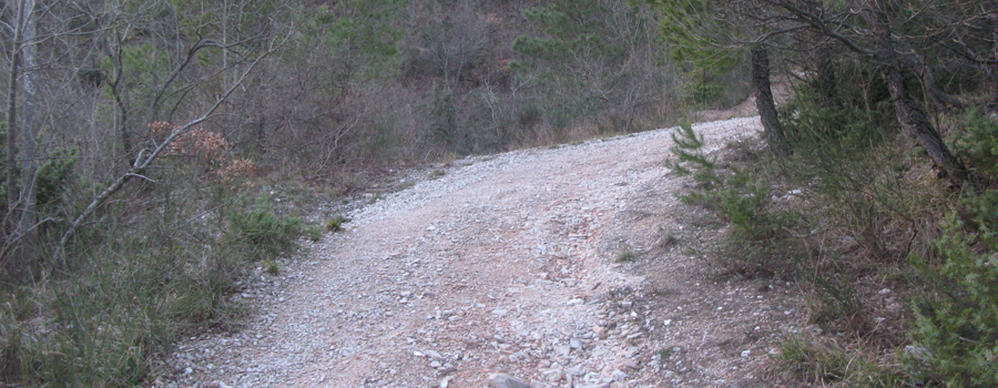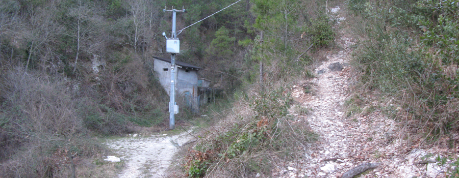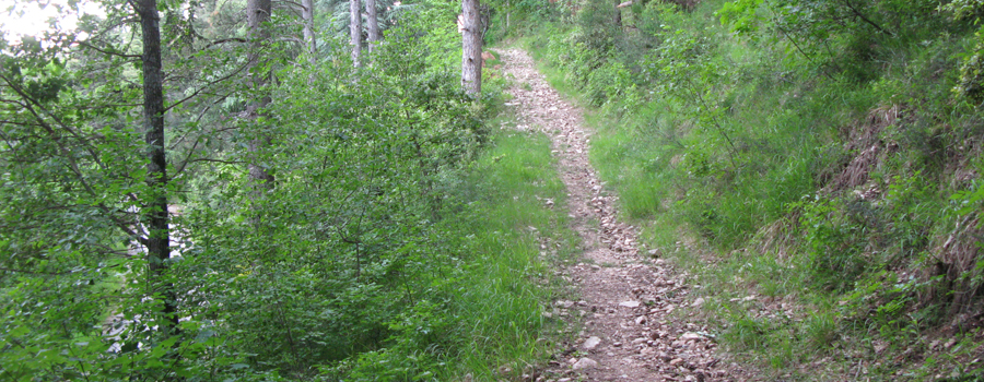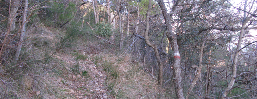 La sterrata termina in corrispondenza della Sorgente Acquasanta (utile per far provvista d’acqua), nei pressi della quale si diparte, sulla destra, un ripido ma ben evidente sentierino, che prosegue all’interno del bosco prima con un lungo traverso e poi disegnando stretti tornanti, il tutto accompagnato da marcate pendenze che rendono questo tratto discretamente impegnativo.