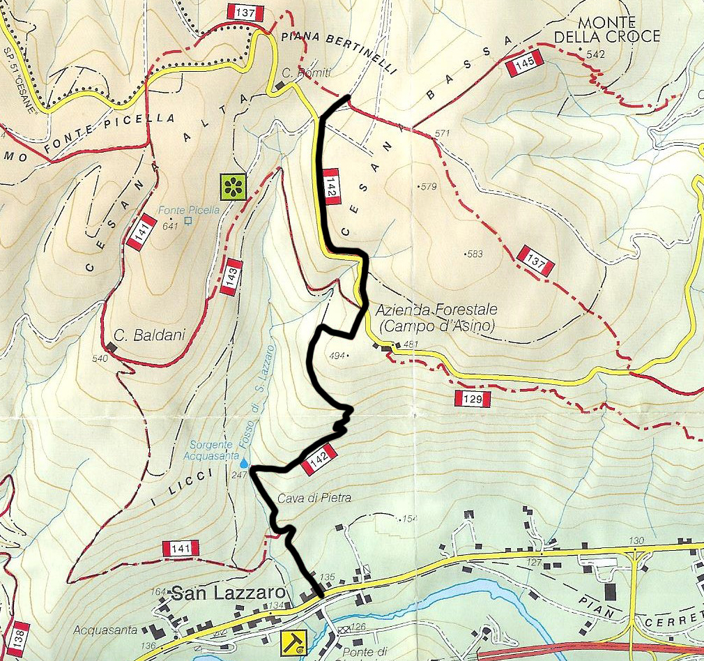 Il sentiero 142 del comprensorio dei Monti delle Cesane collega il piccolo abitato di San Lazzaro, situato sulla vecchia Flaminia pochi chilometri dopo aver oltrepassato Fossombrone, all’area attrezzata denominata “Piana Bertinelli”. Il primo tratto, comune al sentiero 141, ha inizio imboccando una stradina che si inoltra all'interno del paese, asfaltata per un centinaio di metri e poi, appena terminate le case, sbrecciata, che si percorre nella sua interezza oltrepassando il bivio, ben segnalato da una freccia direzionale con tempi di percorrenza, con il 141, che prosegue sulla sinistra mentre la strada sale lentamente sulla destra.