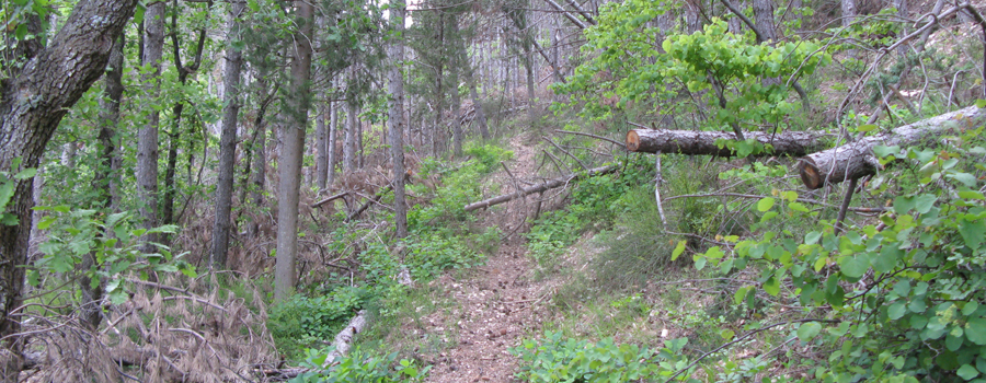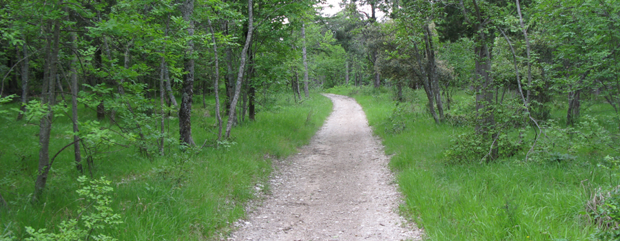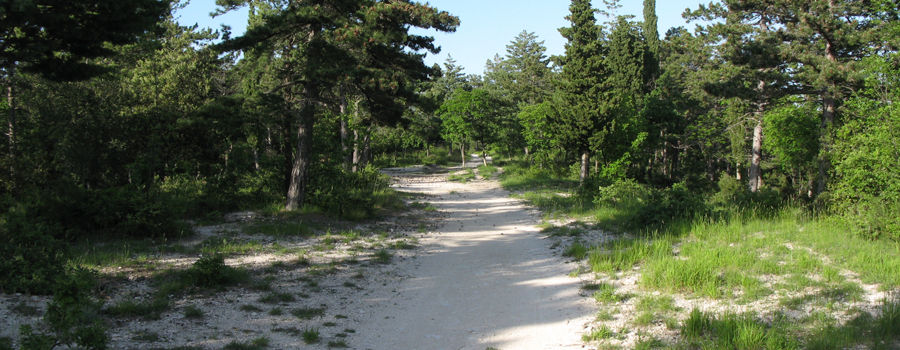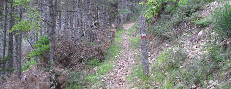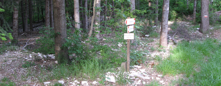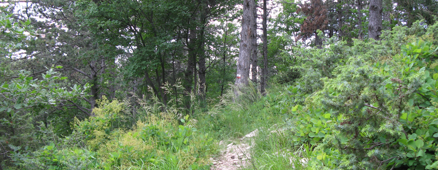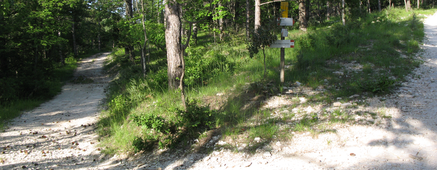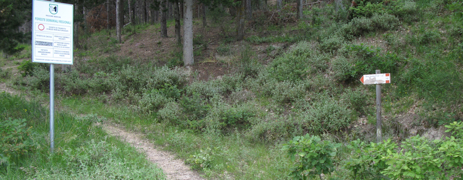 La segnaletica, qui come in tutto il comprensorio, è accurata e permette di non avere problemi di orientamento. Raggiunta la vetta si scende per un breve tratto e si raggiunge in pochi minuti una comoda stradina sbrecciata che prosegue in falsopiano, immersa nei piacevoli boschi della Cesana Bassa. Percorse alcune centinaia di metri si raggiunge infine il bivio con il sentiero 137 che sale da Fossombrone, a poche decine di metri di distanza dall'area di sosta (attrezzata con panchine e tavoli) denominata Piana Bertinelli.