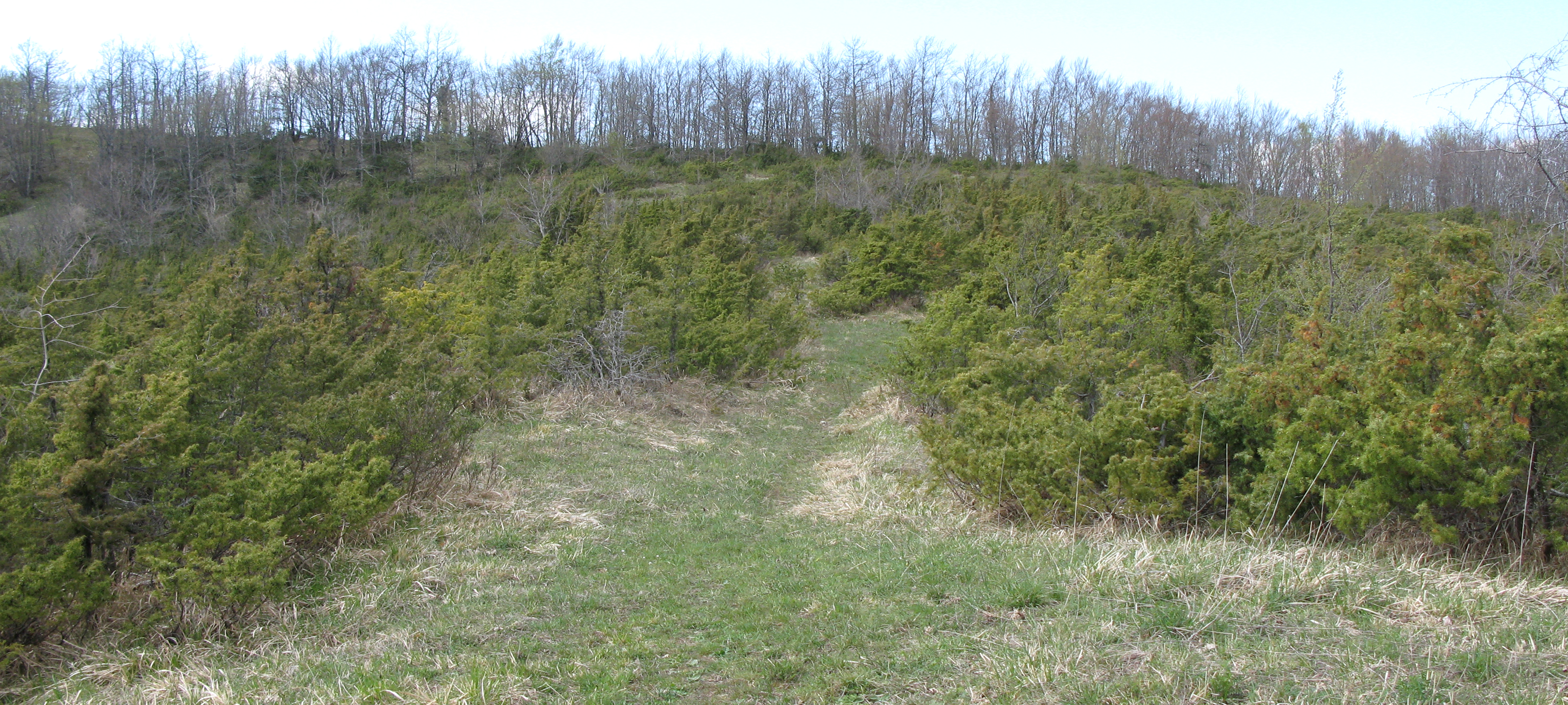 Superato un terzo guado, un po’ più fastidioso dei primi 2 a causa del fango, si inizia a risalire verso il Monte Canale, uscendo dal bosco ed attraversando un bel prato punteggiato da innumerevoli piante di ginepro, da cui si gode, volgendosi di spalle, di una notevole vista sui Sassi Simone e Simoncello.
