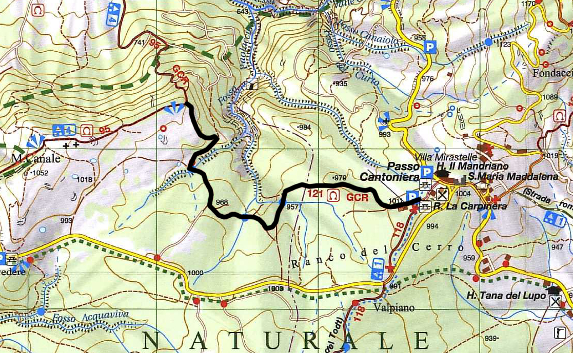 Il sentiero 121 del Parco Naturale del Sasso Simone e Simoncello è un itinerario di medio/bassa difficoltà che collega il Passo della Cantoniera con il sentiero 95, che si incrocia alle pendici nord-orientali del Monte Canale.