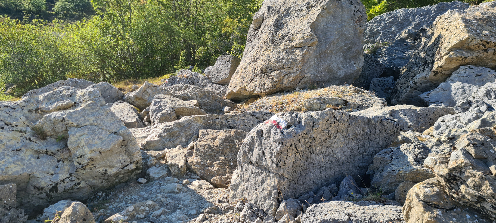 Il successivo tratto è uno dei più intricati, dal momento che si taglia il fianco di una valle su di una traccia incerta e spesso assente, aiutandosi con i pochi segni presenti e superando con qualche difficoltà i numerosi rigagnoli d’acqua, i quali alimentano il torrentello che in questa zona trae origine.
