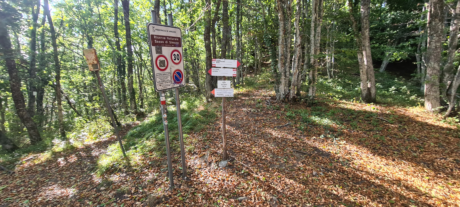 In questo punto si entra nel bosco d’alto fusto che ricopre tutta la zona compresa tra i due sassi, si raggiunge in leggera salita la sella (da qui partono le vie per la vetta del Simoncello, sulla sinistra, e la via di servizio per il Simone, sulla destra; entrambe sono vie attrezzate, consigliabili solo ad escursionisti esperti) e si prosegue entrando nel territorio del Parco Naturale, dove si incrociano in breve due ulteriori sentieri, il 119b (a destra) che funge da raccordo con il 119 ritornando sull’altro versante del sasso e successivamente il 118 (in località Banditella, ancora a destra), diretto al Passo Cantoniera.