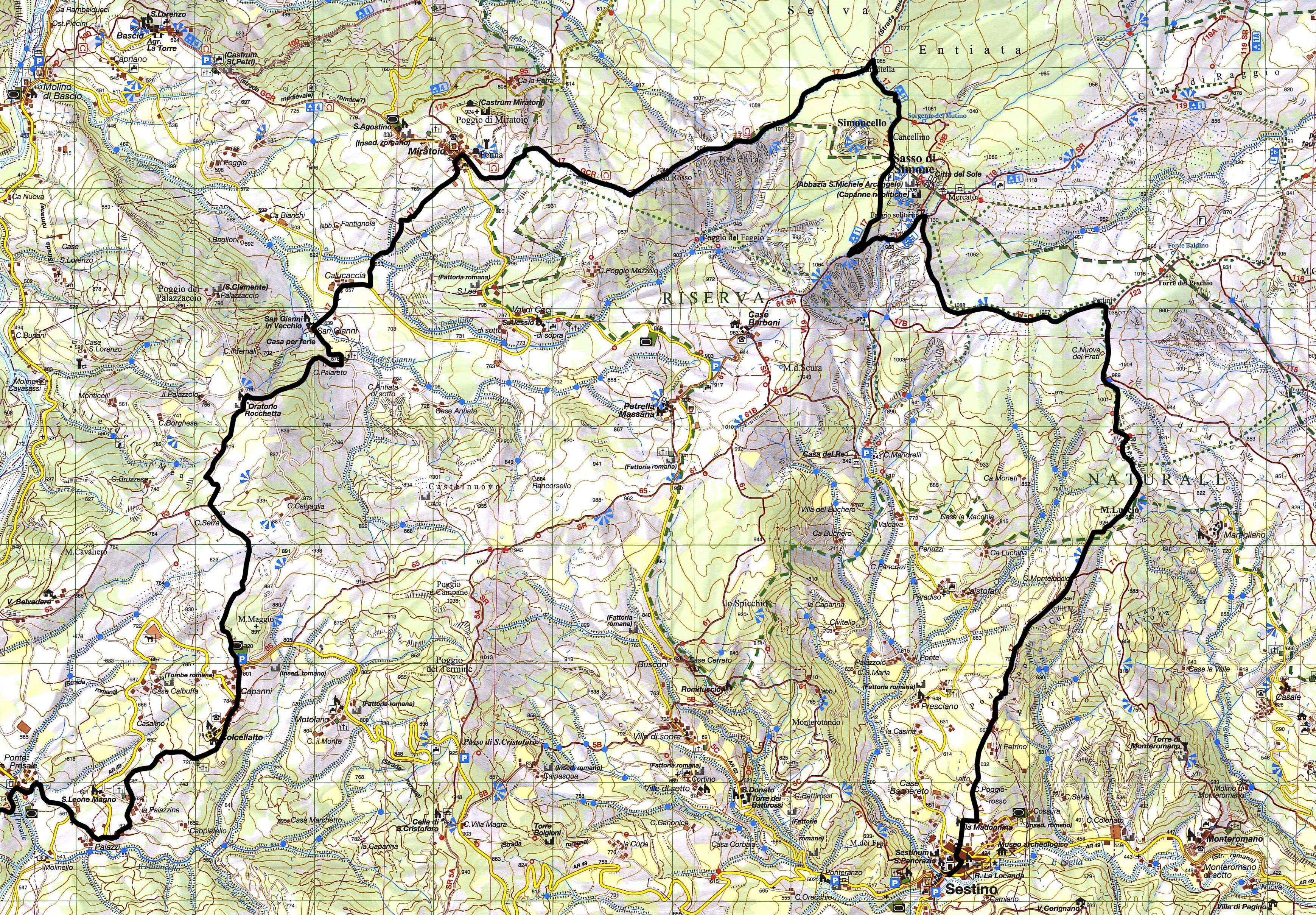 La partenza è situata nella piazza centrale di Sestino, di fronte al palazzo comunale, dove si imbocca una via che inizia a salire con media pendenza tra le case; ben presto, oltrepassata una chiesetta, le abitazioni lasciano spazio ai primi campi che si attraversano per poi raggiungere una sterrata, sempre in salita.